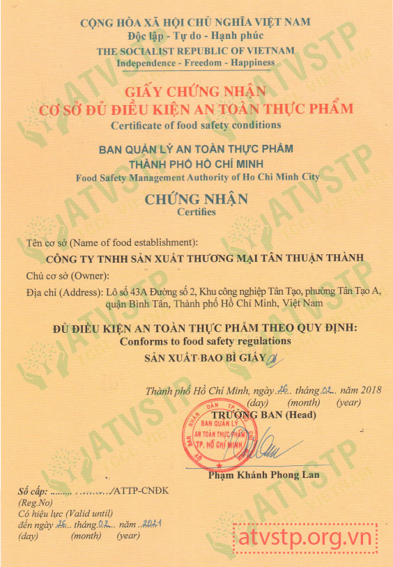 Giấy chứng nhận an toàn vệ sinh thực phẩm (hay giấy phép VSATTP) là văn bản pháp…
